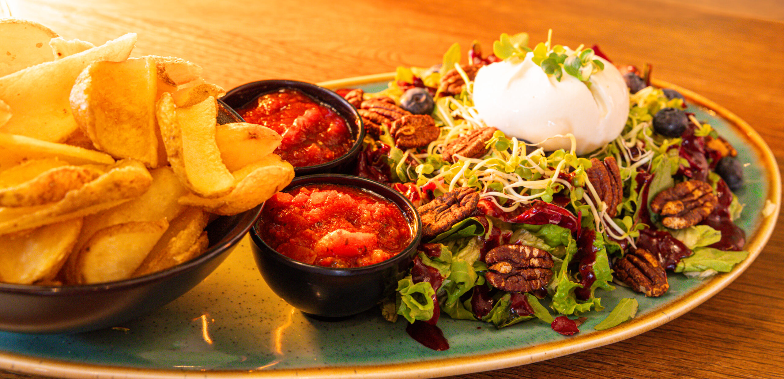 Bei uns findet Ihr auch eine vielseitige Auswahl an liebevoll entwickelten vegetarischen und veganen Burgern.